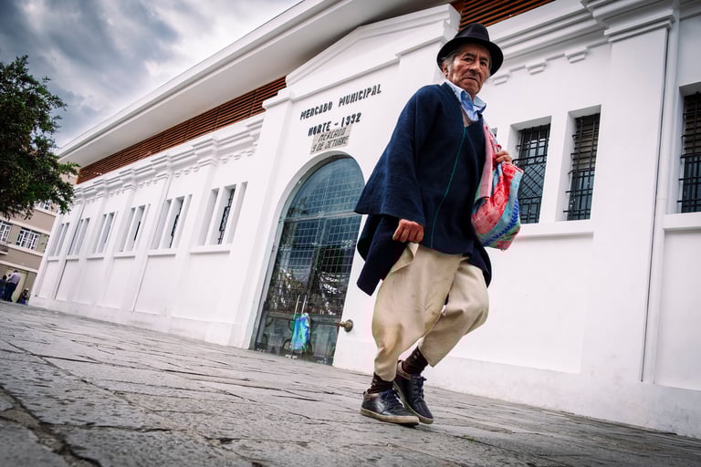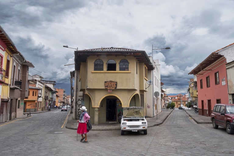 Ma fille travaillait à Cuenca, en Équateur. Je suis resté chez elle pendant un mois et durant ce mois, j’ai marché tous les jours, à la même heure, parcourant les mêmes rues et les mêmes places. Difficile en arrivant de ne pas être pris par l’exotisme d’une ville comme Cuenca. Églises baroques, indiens et indiennes portant des chapeaux, des jupes plissées de couleurs vives, tout est là pour vous transporter ailleurs mais, je ne voulais pas tomber dans cet exotisme et photographier ces clichés touristiques.